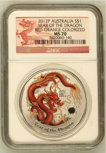 31.11 g., 0.999 Silver 0.999 oz. ASW, 40mm. Ruler: Elizabeth II Subject: Year of the Dragon Obv: Head with tiara right Rev: Dragon colored orange, brown and yellow.