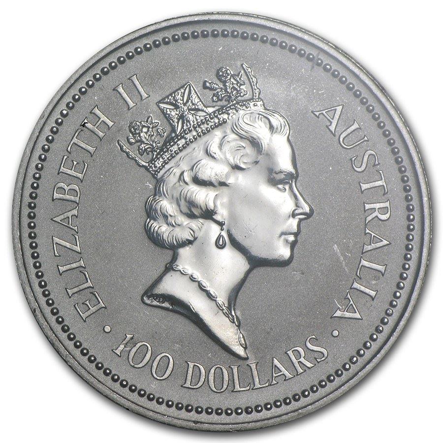 Product ID: 54969 Year: Random Grade: Brilliant Uncirculated Grade Service: None Denomination: $100 (AUD) Mint Mark: None Metal Content: 1 troy oz Purity: .9995 Manufacturer: Perth Mint Thickness: 2.7 mm Diameter: 32.1 mm