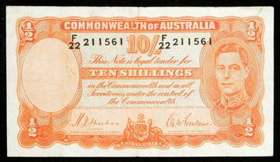 Australia. 10 Shillings, ND (1939-1952). P-25a. Orange sign. H.J. Sheehan and S G. McFariane (1939). Clean, sharp corners. Very Fine.