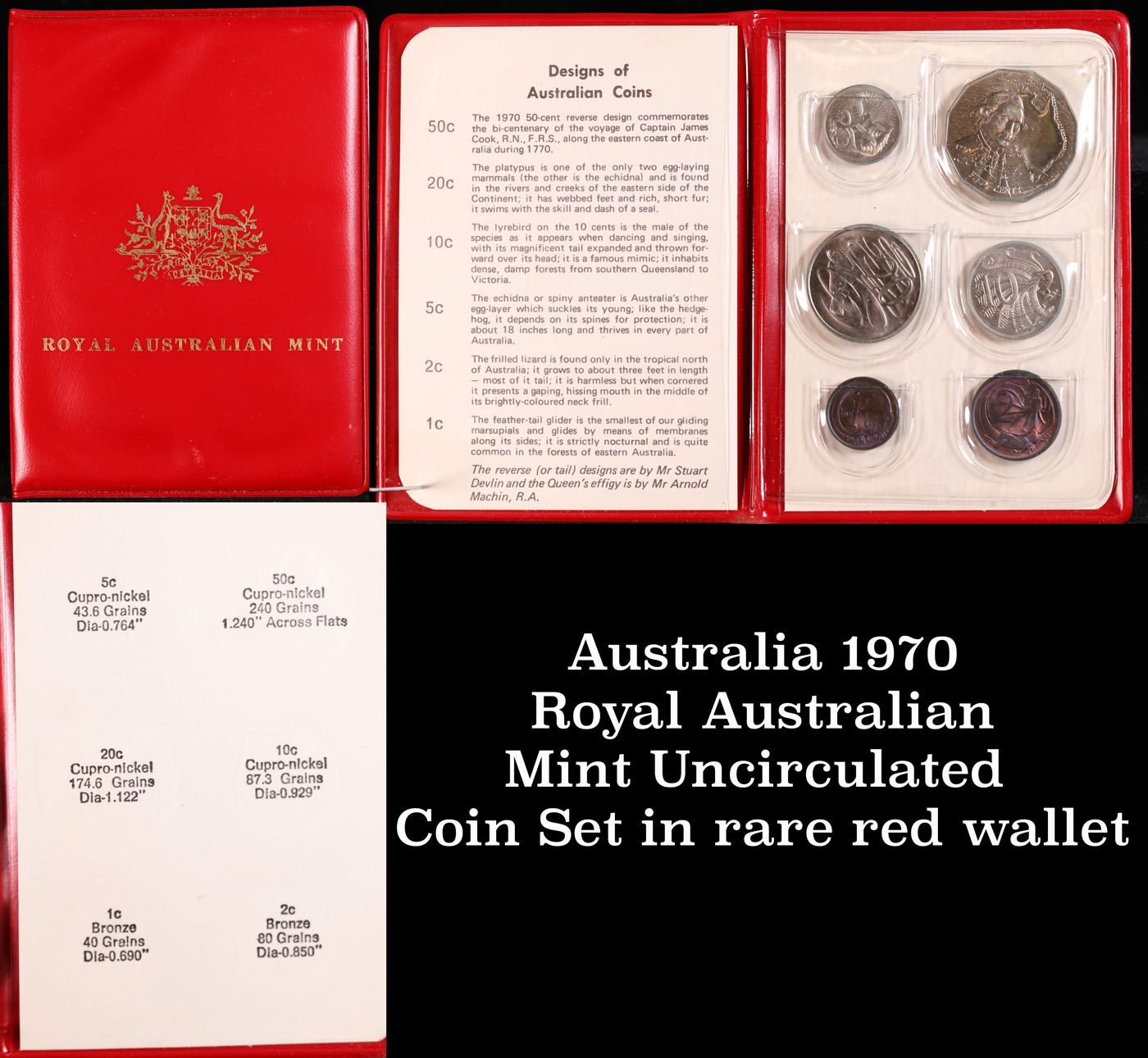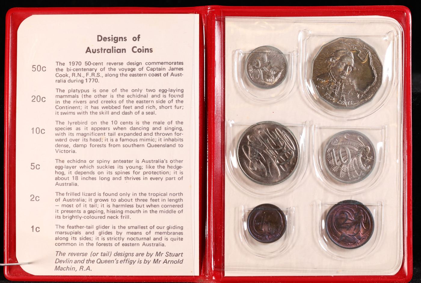 Australia 1970 Royal Australian Mint Uncirculated Coin Set in rare red wallet. Coin issue in 1970 by the Royal Australian Mint, in Original Red Cover with original information card