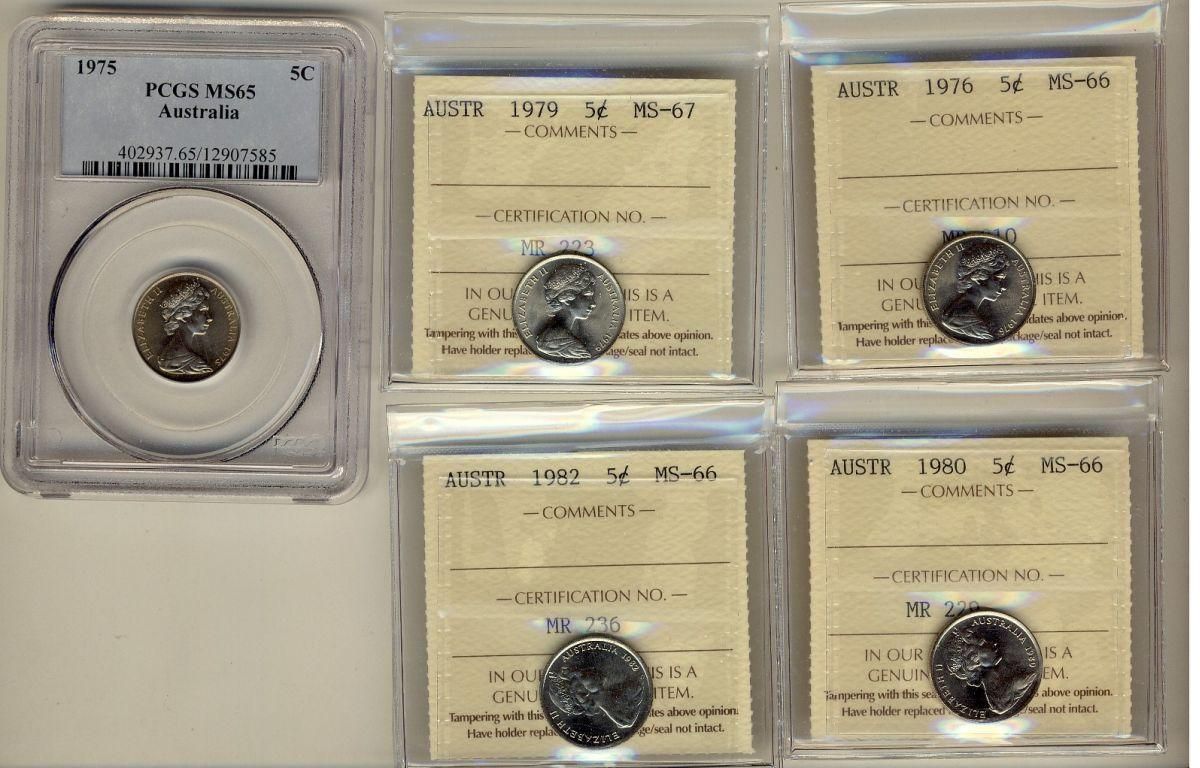 Australia 1975 5¢ PCGS MS65, 1976 ICCS MS66, 1979 ICCS MS67, 1980 ICCS MS66, 1982 ICCS MS66. All 5 coins have full Lustre.