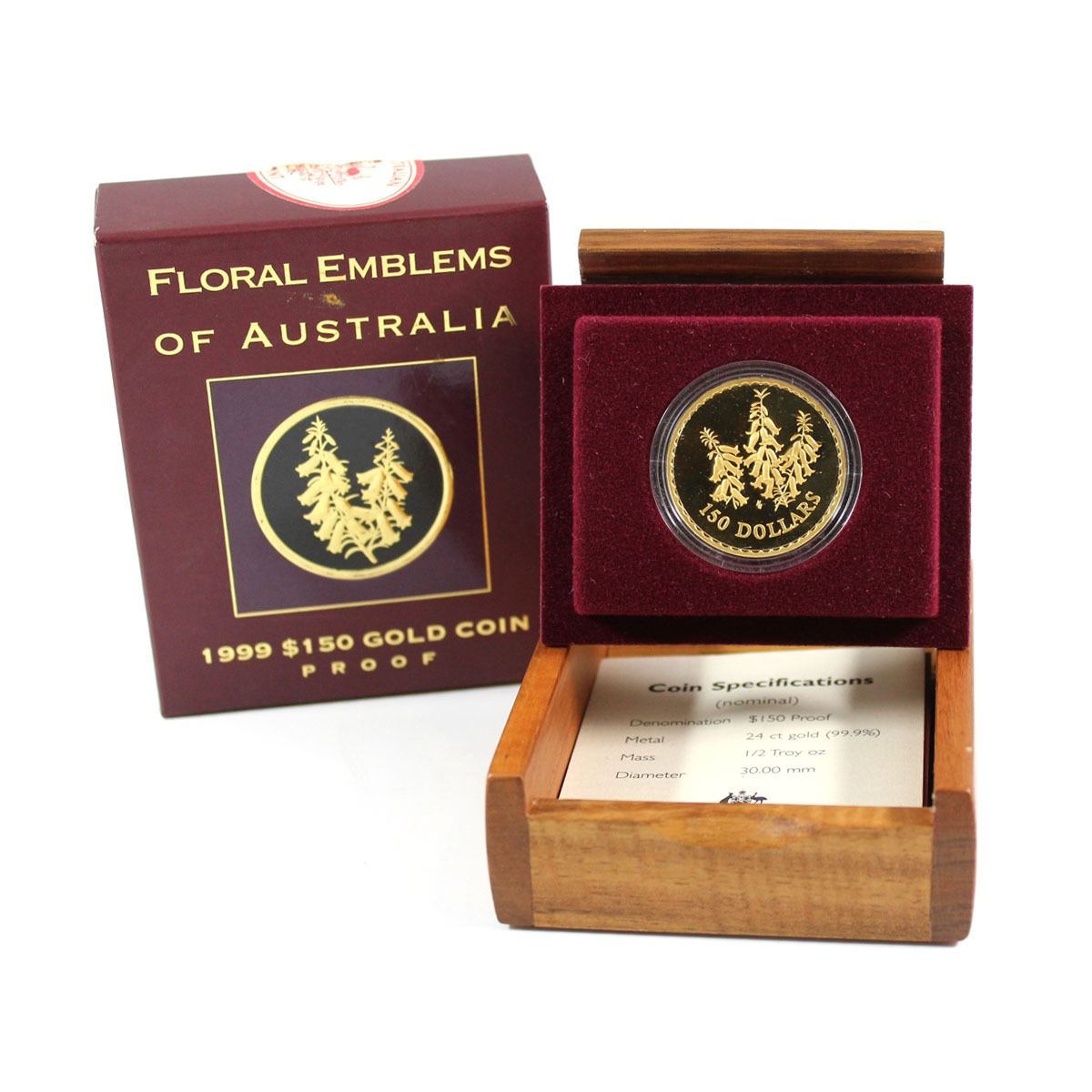 Australia; 1999 Floral Emblem of Australia 24-karat $150 Gold Proof coin (TAX Exempt). This coin contains 1/2 oz of Pure Gold and has a Limited mintage of 1500 world wide. Coin comes with all original Mint packaging (coin capsule and outer box are scuffed)