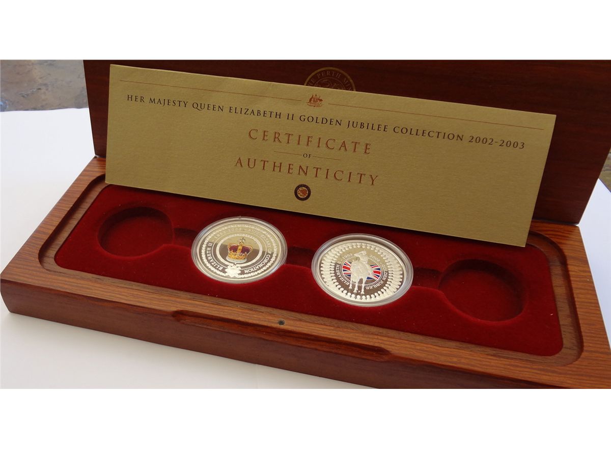 Contains 1 Ounce 99.99% Pure Silver Coloured Proofs commemorating the Golden Jubilee of the Accession and Coronation of Queen Elizabeth II. In 4 coin case with certificate FDC