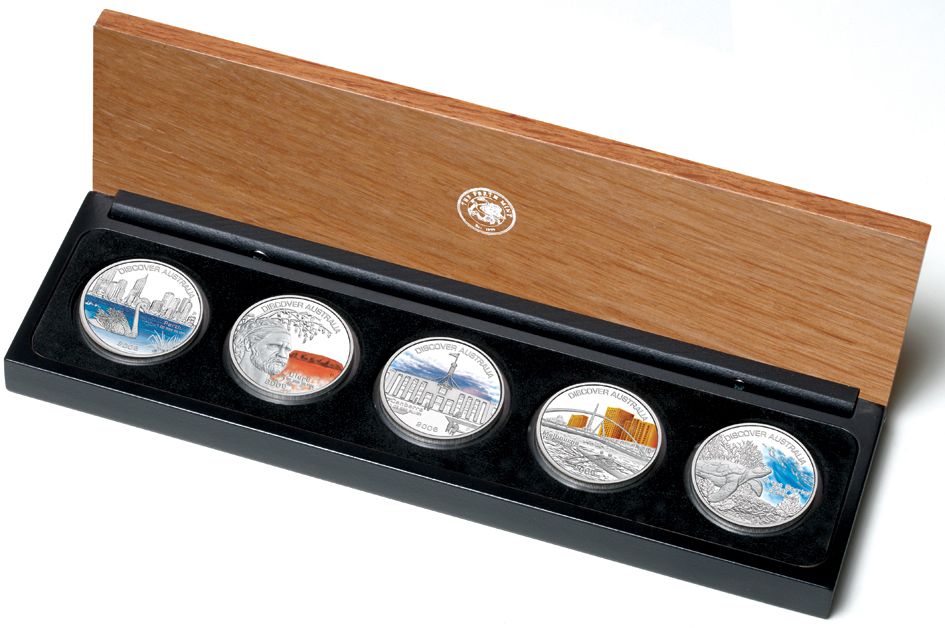 Five One Ounce .999 fine Silver Proofs showing Melbourne, Uluru, Canberra, Perth and the Great Barrier Reef. In box and wooden case with certificates. FDC