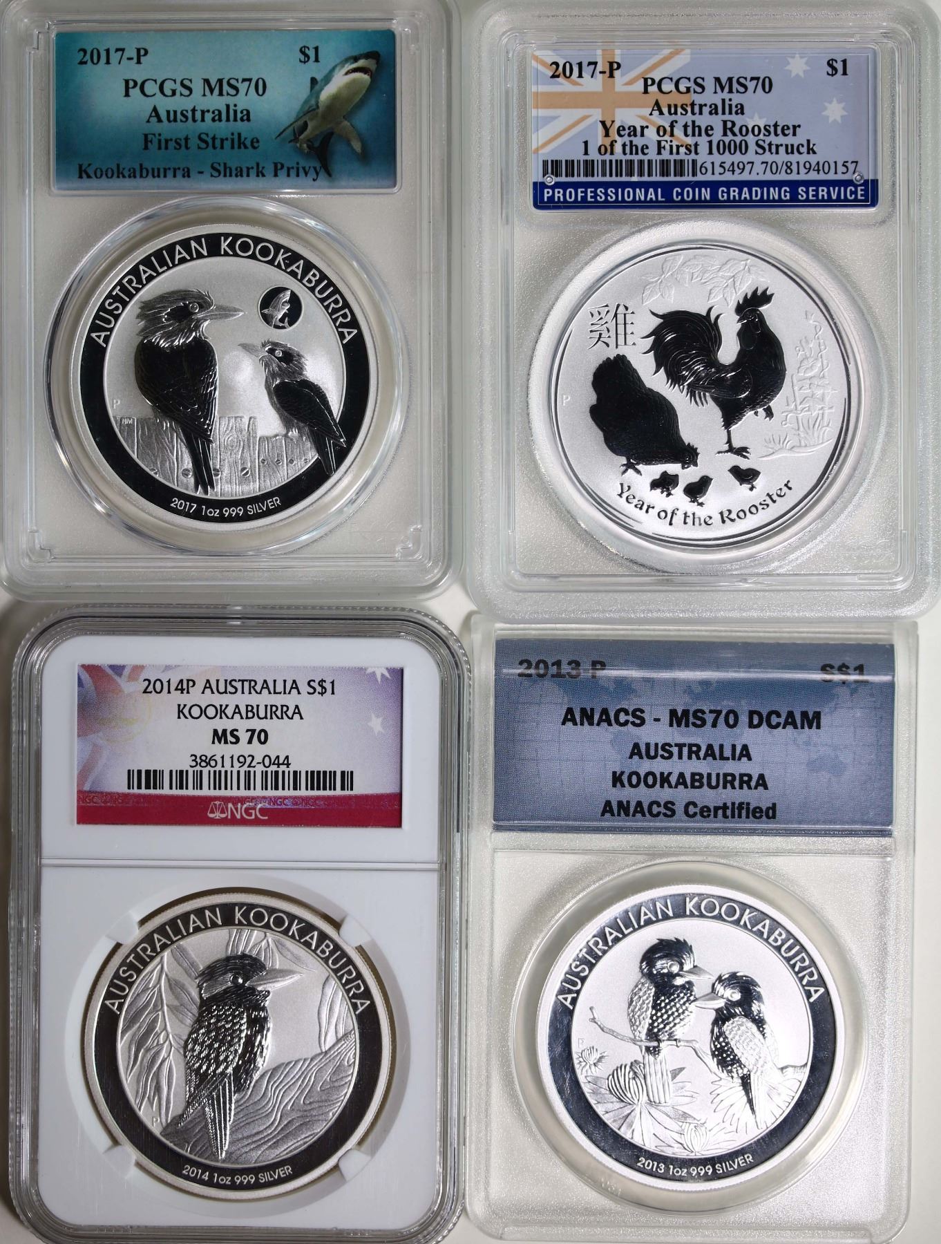 Australia; 2013-P $1 ANACS, 2014-P $1 NGC, 2017-P 1$ Year of the Rooster PCGS, 2017-P $1 First Strike PCGS, all coins graded MS70