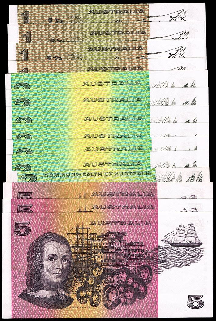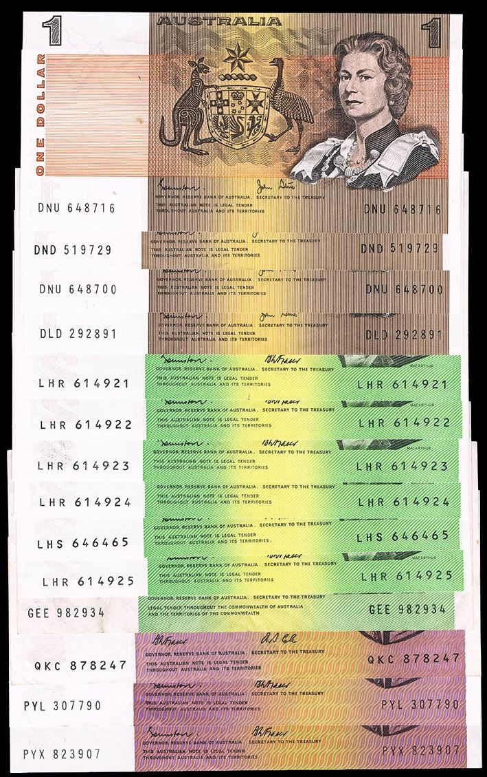 One Dollar Johnston/Stone, 1982 (4); Two Dollars Phillips/Randall, 1968 (1), Johnston/Fraser (6); Five Dollars Johnston/Fraser, 1985 (2) Fraser/Cole, 1991 (1) gFine - aEF (14 notes)