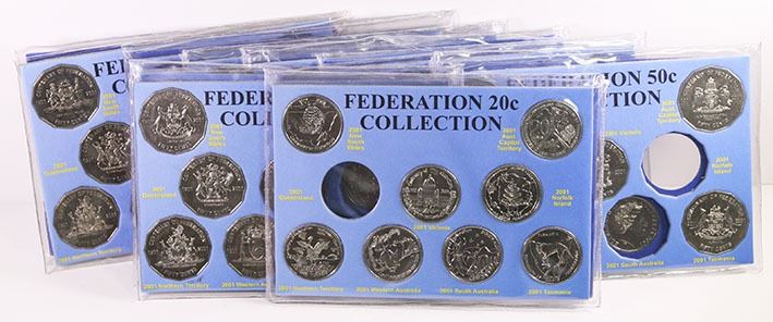 Centenary of Federation Fifty & Twenty Cent Collection, 2001, graded Extremely Fine -Brilliant Uncirculated. Six sets missing 3 coins: 50c, SA & NI; 20c, QLD; One set missing 3 coins: 50c NSW & SA, 20c ACT; One set missing 3 coins: 50c, ACT, SA & TAS (8 sets in total)