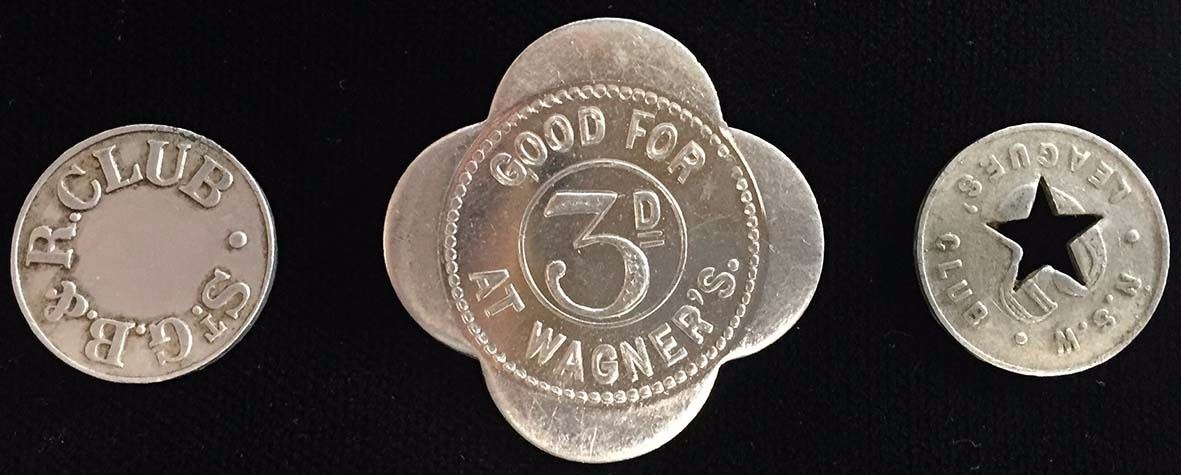 F.H.Wagner Jeweller North Adelaide Threepence 34mm in aluminium; St George Bowling & Recreational Club Sixpence 20mm in aluminium by G.A.Miller & Sons; NSW leagues' Club sixpences 20mm in aluminium holed. Fine to good extremely fine. (3)