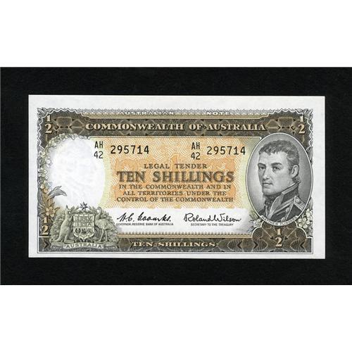 <B>Australia</B></I> Commonwealth of Australia 10 Shillings ND (1961-1965) Pick 33a<BR>A light teller crinkle near the portrait the only distraction on this very lovely note from a popular country. <B>Crisp Uncirculated.</B></I><BR><BR><b>Shipping:</b> Coins & Currency (<a target="_blank" href="http://www.heritageauctions.com/common/shipping.php">view shipping information</a>)