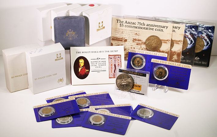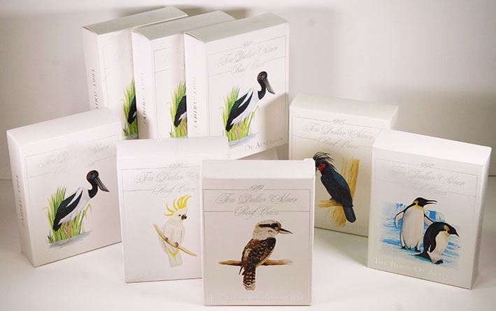 Proof One Dollar (5)(one missing outer cardboard box), 1984; Proof Ten Dollars, Birds of Australia Series, 1989, 1990, 1991 (4), 1992, 1993; Holey Dollar & Dump Silver Commemorative Issue, 1988; Five Dollar Proof Coin (2), 1988; Uncirculated Five Dollars, 1988 (1), 1990 (2), 1992 (2); Uncirculated Five Dollars, Enfranchisement of Women (9), 1994