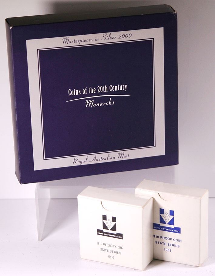 Masterpieces in Silver, Monarchs, 2000; Ten Dollar Silver Proof, State Series, 1985-86 (2)