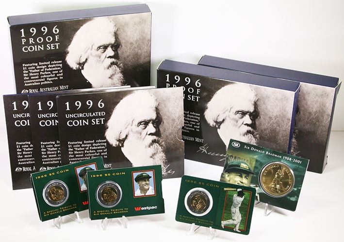Uncirculated Coin Sets (3), Proof Sets (3) (one with handwritten date on cardboard box), Sir Henry Parks; Uncirculated Five Dollars, Sir Donald Bradman (4), 1996