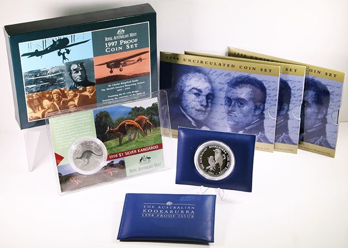 Proof Set, Sir Charles Kingsford Smith, 1997; Uncirculated Coin Sets, Bass & Flinders, 1998 (3); Uncirculated 1oz Silver Kangaroo; Proof 1oz Silver Kookaburra, 1998