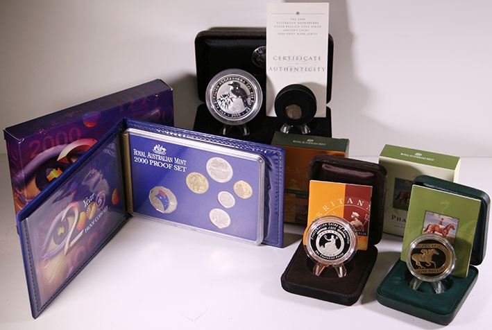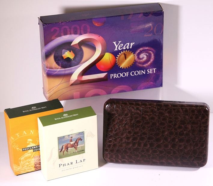 Proof Set, Millennium, 2000; 2oz Silver Kookaburra - Ancient Coins Privy Mark Series including silver English hammered coin, 2000 (vinyl has peeled away on the bottom of the box); Five Dollar Proof Coin, Phar Lap, 2000; One Dollar Silver Proof, Proclamation Coins of Australia, 2000.