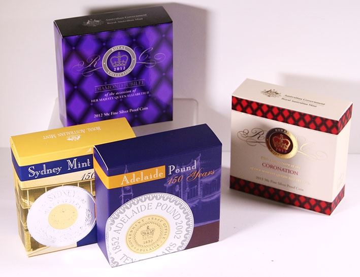 Silver Proof Ten Dollars, 2002 150th Anniversary of the Adelaide Pound (missing cert), 2003 150th Anniversary of the Sydney Mint Pattern Sovereign; Silver Proof Fifty Cents, 2012 Diamond Jubilee of the accession of Queen Elizabeth II, 2013 60th Anniversary of the coronation of Queen Elizabeth II
