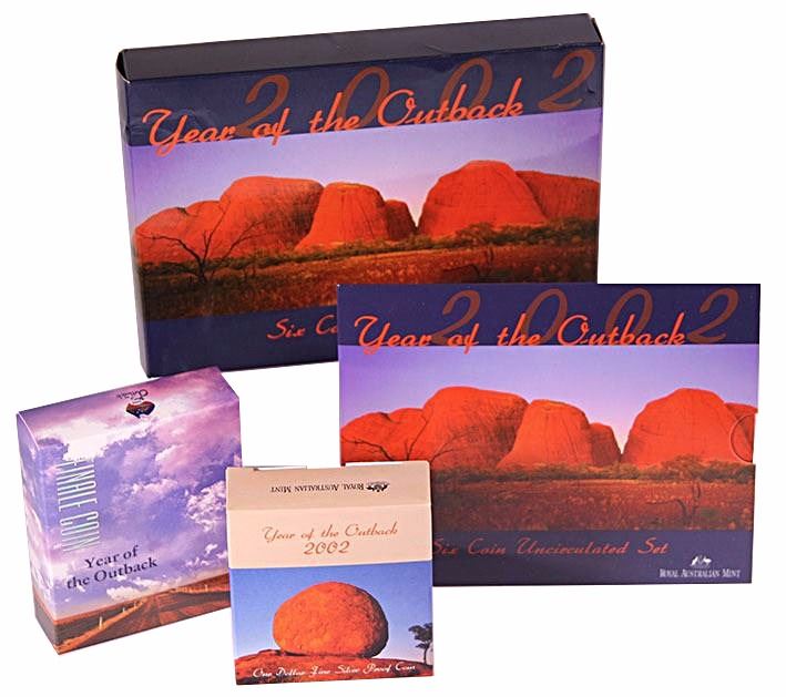 Year of the Outback, 2002, Proof Set, Mint Set, One Dollar Silver Proof, Five Dollar Silver Proof Hologram Finale Coin (vinyl has peeled away from sections of case)