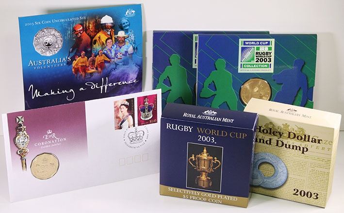 Five Dollar 1oz Fine Silver Proof Coin, Rugby World Cup; Uncirculated Five Dollars, Rugby World Cup (2); One Dollar Silver Proof, Holey Dollar and Dump; Uncirculated Coin Set, Australia's Volunteers; Uncirculated Fifty Cents, QEII Coronation Golden Jubilee, PNC, 2003