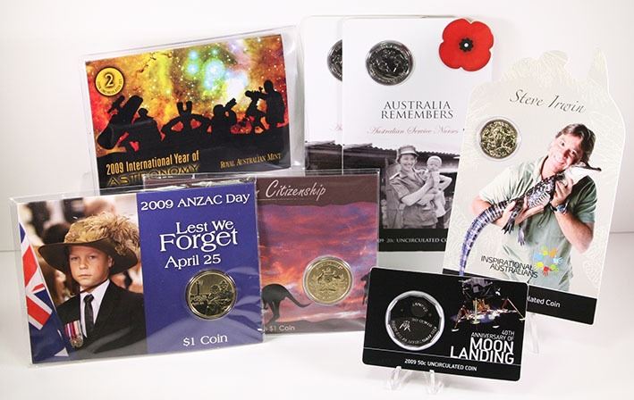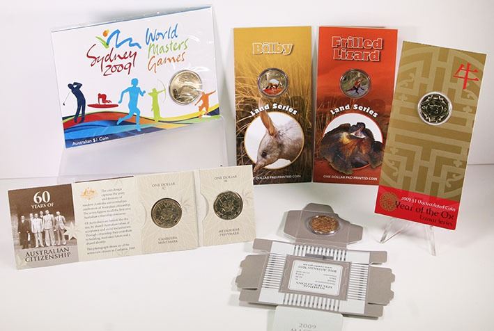 Uncirculated One Dollar, Land Series Frilled Lizard, Bilby; Lunar Year of the Ox; 60 Years of Australian Citizenship 'M' (1), 'C' (1); Master Mintmark; Steve Irwin; Australian Citizenship; ANZAC Day; Sydney World Masters Games; Uncirculated Fifty Cents, 40th Anniversary of Moon Landing; Uncirculated Twenty Cents, Australia Remembers Australian Service Nurses (2); Uncirculated Two Coin Set, International Year of Astronomy, 2009