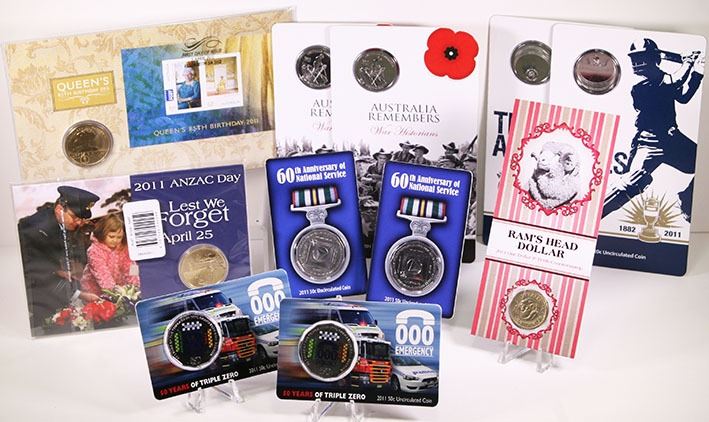 Uncirculated one dollar, Lest we Forget; Ram's Head Dollar (this coin had been removed from card and is stuck down with tape); Queen's 85th Birthday PNC; Uncirculated fifty cents, 60th Anniversary of National Service (2); 50 Years of Triple Zero (2); Uncirculated twenty cents, Australia Remembers - War Historians (2); The Ashes (2), 2011