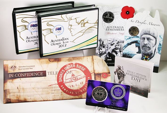 Uncirculated One Dollar Coin Set, Australian Olympic Team featuring 5 x one dollar coins representing a variety of Olympic Events (2); Uncirculated One Dollar Four Coin Set, Wheat Sheaf; Uncirculated Two Coin Set, Australian Wheat Fields of Gold; Uncirculated Two Dollar, Remembrance Day Poppy; Uncirculated One Dollar, Animals of the Zoo Southern Corroboree Frog, Goodfellow's Tree-Kangaroo, Asian Elephant, Orang-Utan, Sumatran Tiger, Western Lowland Gorilla; Sir Douglas Mawson; Uncirculated Fifty Cents, 70th Anniversary of the Kokoda Trail (2); Diamond Jubilee; 50th Anniversary of the Australian Ballet; Uncirculated Twenty Cents, Australia Remembers Merchant Navy; Uncirculated Three Coin Set, Shores Under Siege, 2012
