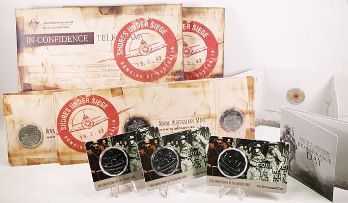Uncirculated coloured two dollar, Remembrance Day, Poppy, 'C' Mintmark (2); Uncirculated twenty-fifty cents, Shores Under Seige three coin set (2); Uncirculated fifty cents, 70th Anniversary of the Kokoda Trail (3), 2012