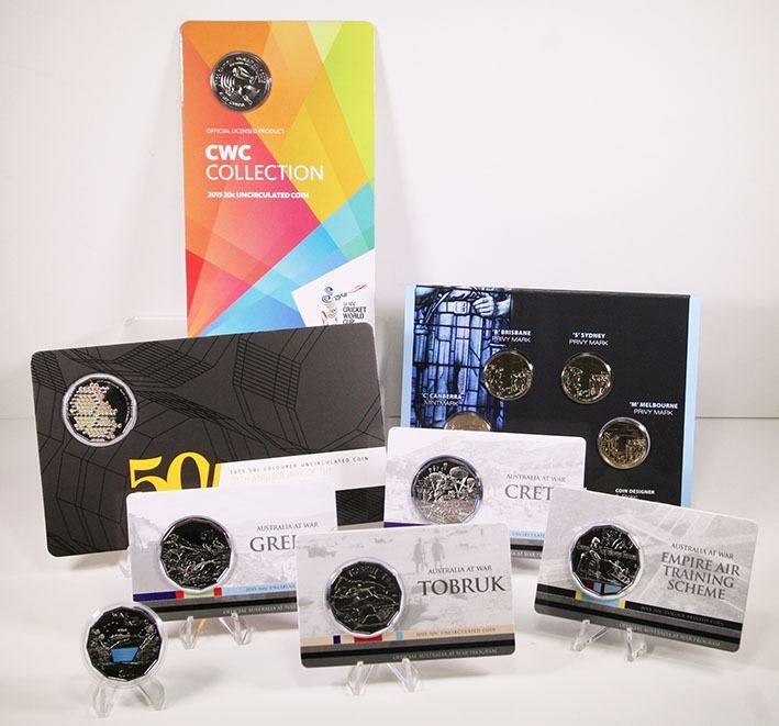 ANZAC Centenary One Dollar Four Coin Mintmark & Privy Set; Uncirculated fifty cents, Australia at War series, Empire Air Training Scheme, Crete, Greece, Tobruk & War in the Pacific (in capsule only); Uncirculated coloured fifty cents, 50th Anniversary of the RAM; Uncirculated twenty cents, CWC Collection, 2015
