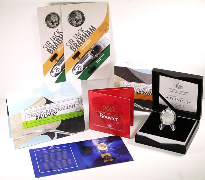Lunar Year of the Rooster uncirculated fifty cent coin; Centenary of the Trans-Australian Railway four coin uncirculated mintmark + privy set; Centenary of the Trans-Australian Railway one dollar fine silver proof coin; Lest We Forget two dollar coloured uncirculated coin; Sir Jack Brabham fifty cent coloured uncirculated coin (2), 2017