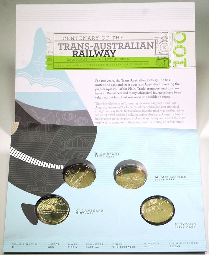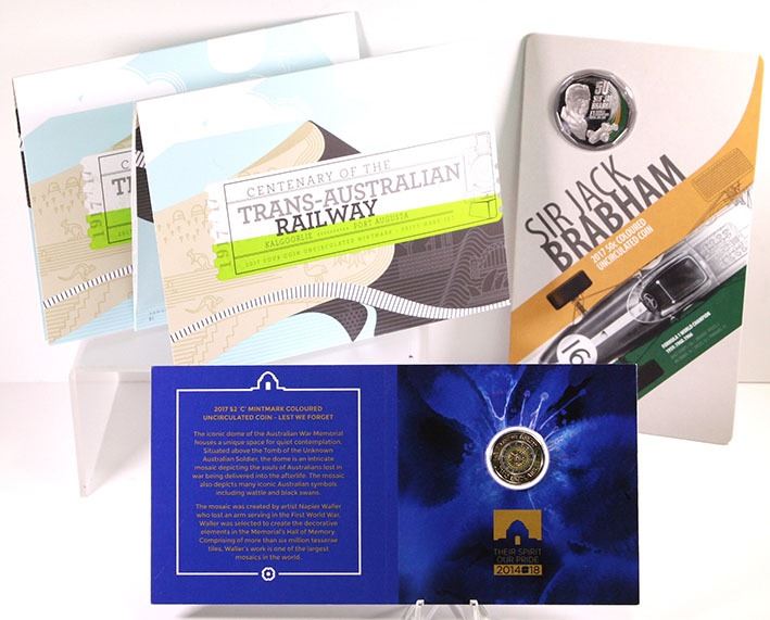 Centenary of the Trans-Australian Railway four coin uncirculated mintmark + privy set (2)(one set damaged with sleeve torn to remove coins), Lest We Forget two dollar coloured uncirculated coin, Sir Jack Brabham fifty cent coloured uncirculated coin, 2017
