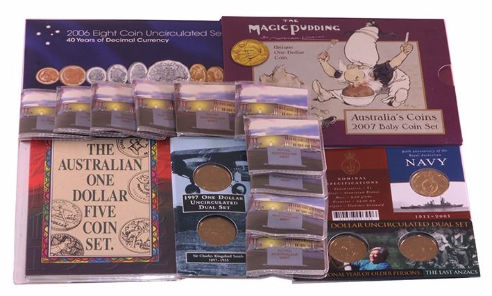 Uncirculated Baby Set, 2007; together with Uncirculated Set, 2006; plus Uncirculated One Dollar, 1988-92 5-coin set; 1991 Roo (10, private packaging); 1997 Kingsford Smith Pair; 1999 Older Person/ Anzac Pair; 2001 Navy (16 items)