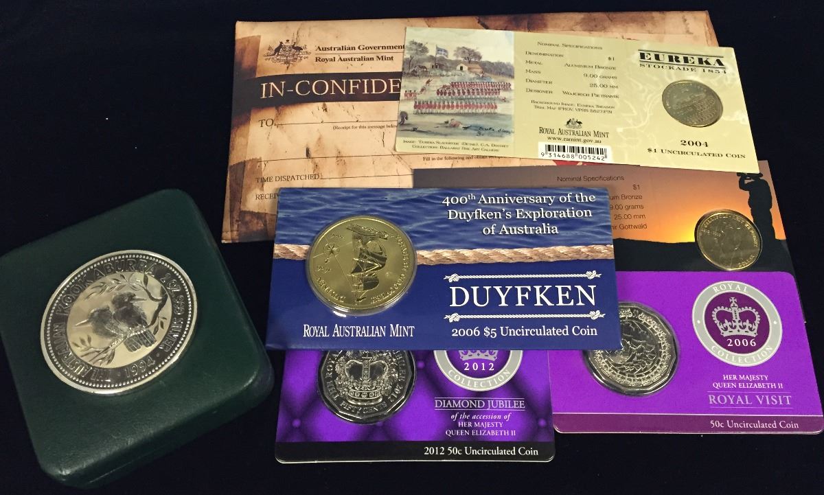 Twenty cents and fifty cents Shores Under Siege 3 coin set; Fifty cents, 2006 Royal Visit, 2012 QEII Diamond Jubilee; One dollar, 2004 C, 2005 C; Two dollars, 1994 2oz Kookaburra Specimen; Five Dollar, Duyfken. (7)
