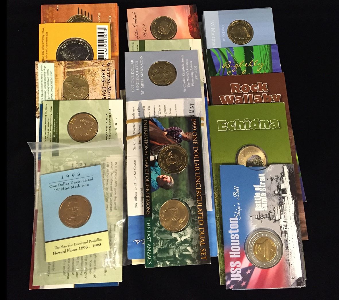 Fifty cents, 2004 student design; One dollar, 1995 C, 1996 M, 1997 M, 1997 dual pack, 1998 M, 1999, C,S,M, 1999 dual pack, 2000 HMAS Sydney C, Olymphilex C,S, 2001 Air Force, Army , Navy, 2002 C,M, 2003 S,B,M, 2004 C,S,M,E,B, 2005 C,S,M,B, 2006 C,S,M,B,2007 seahorse, white shark, 2008 Echidna, wallaby; Five dollar, 2002 HMAS Perth, USS Houston. (40 items)