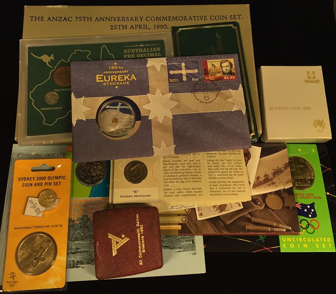 Fifty cents, 2006 student design; One dollar, 1984 John West commemorative cover, 2004 C,B,S,E, 2005 prooflike ANZACs Pair; Five dollars, 1988 proof, 1990 proof ANZACs pair, 2000 Olympics Basketball, 2004 Eureka PNC (4); Ten dollars, 1982; Mint set, 1992; NPA folder, 1988 ten dollar bicentenary, together with a cased predecimal set. (18 items)