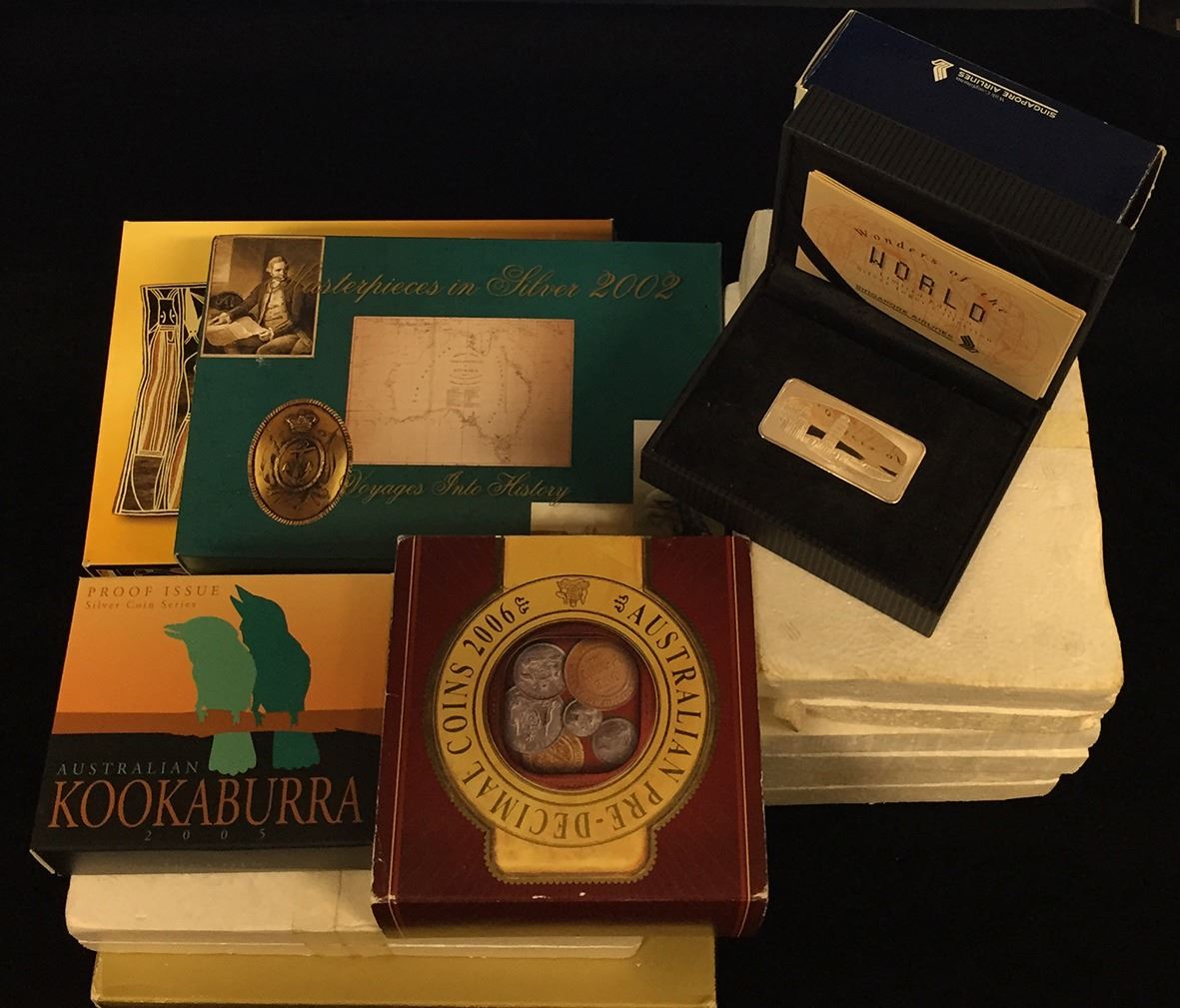 One dollar, 2005 1oz silver proof kookaburra, 2006 1oz silver pre-decimal locket coin; Masterpieces in silver, 2002; Proof set, 1977, 1978, 1979, 1980, 1988, 1990. Together with a silver ingot issued by Singapore Airlines. (10 items)