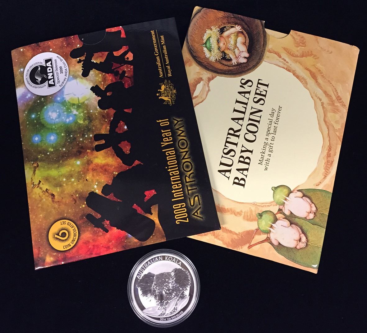 One dollar, 2014 1oz silver Koala; Mint set, 1994 baby set wide date, 2009 International Year of Astronomy ANDA special release. (3)