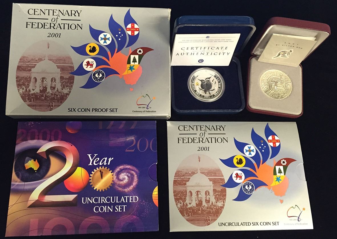 One dollar, 2001 1oz kangaroo cased uncirculated, 2001 1oz Kookaburra Federation privy; Mint set, 2000, 2001; Proof set, 2001 missing inner carboard sleeve. (5 items)