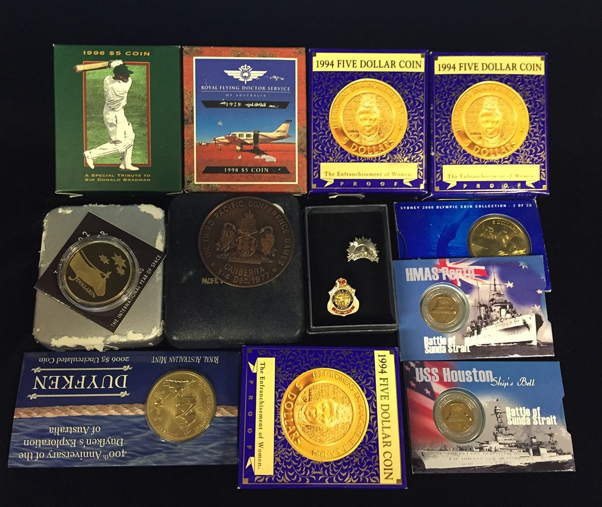 Five dollars, 1992 Proof Space, 1994 Proof The Rnfranchisement of Women, 1996 Proof Sir Donald Bradman, 1998 Flying Doctor, 2000 Olympics - Aquatics, 2002 HMAS Perth and USS Houston uncirculated, 2006 Duyfken uncirculated, plus the Canberra bronze medal and a modern badge from RSL. (12)