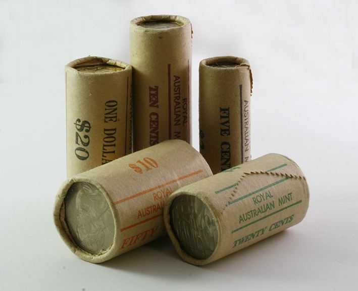 Australian Decimal Mint Rolls, Five Cents 1982, Ten Cents 1982, Twenty Cents 1981, Fifty Cents 1980, One Dollar 1985 (5 rolls), all heads/tails