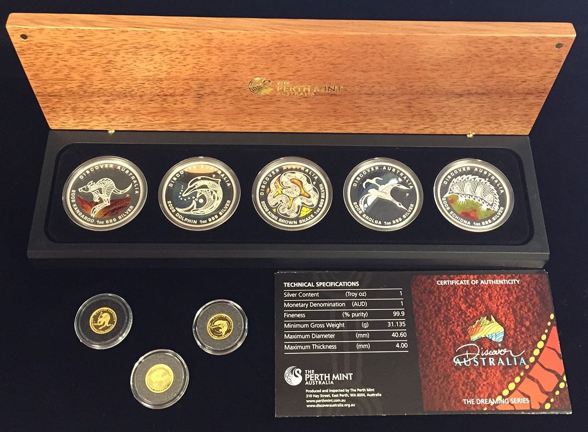 Discover Australia Series, 2009 one dollar 1oz silver proof 5 coin set; 2009 five dollars 1/25oz gold proof Dolphin, Kangaroo, Koala. The silver coins are in their capusles and box with certificate, the gold coins are in theri capsules only. (8)
