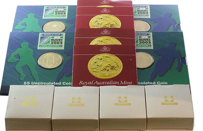 Uncirculated Five Dollars 2003 Rugby World Cup (4); together with Proof One Dollar 1984 (4) Uncirculated One Dollar 1984 (4) (12 Coins)