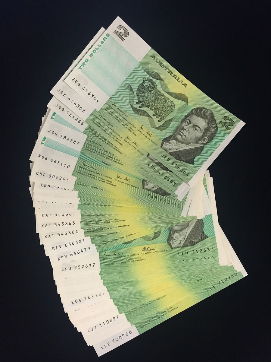 Two dollars, Knight/Stone 1979 (R.86) (4), Johnston/Stone 1983 (R.87) (21), Johnston/Fraser 1985 (R.88) (25). Some in consecutive runs, good very fine to almost uncirculated. (50)