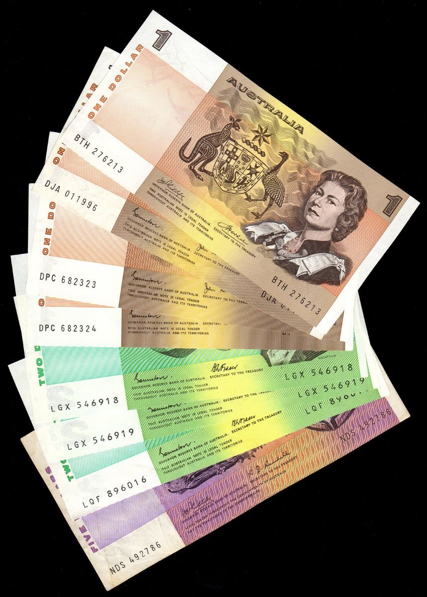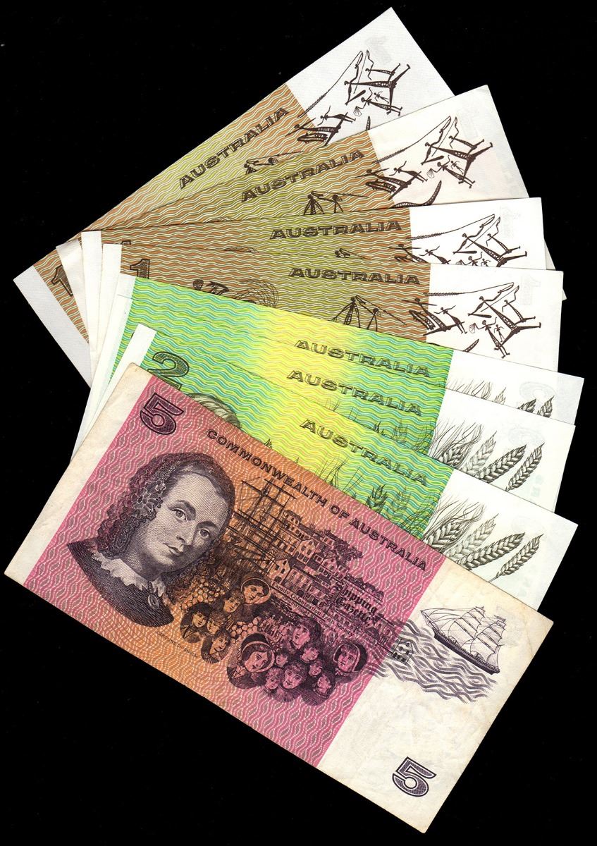 One dollar, Phillips/Wheeler Aust. (R.75), Johnston/Stone (R.78) (3); Two dollars, Johnston/Fraser (R.89) (3); Five dollars, Phillips/Randall (R.203); Fine to uncirculated. (8)