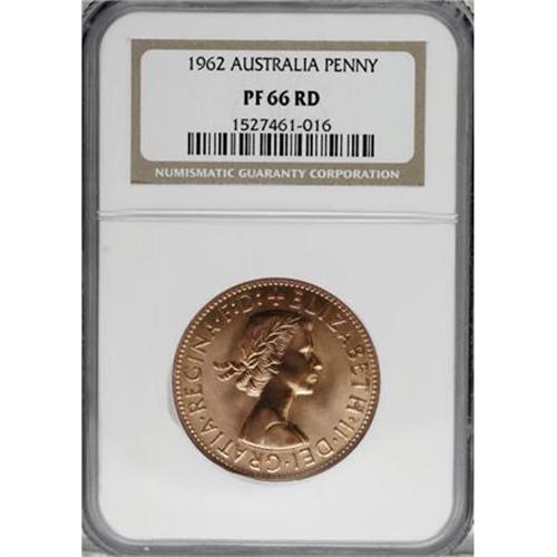 <B>Elizabeth II Proof Penny 1962 Perth,</B></I> KM56, Proof 66 Red NGC. A fully brilliant obverse with minor reverse toning.<BR><BR><b>Shipping:</b> Coins & Currency (<a target="_blank" href="http://www.heritageauctions.com/common/shipping.php">view shipping information</a>)