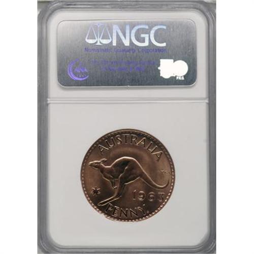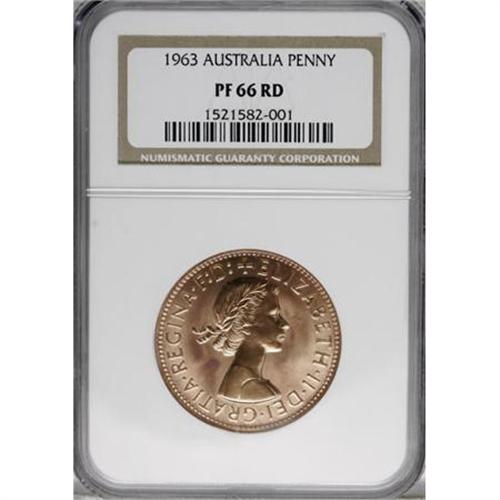 <B>Elizabeth II Proof Penny 1963 Perth,</B></I> KM56, Proof 66 Red NGC. Sharply struck with full mint brilliance.<BR><BR><b>Shipping:</b> Coins & Currency (<a target="_blank" href="http://www.heritageauctions.com/common/shipping.php">view shipping information</a>)