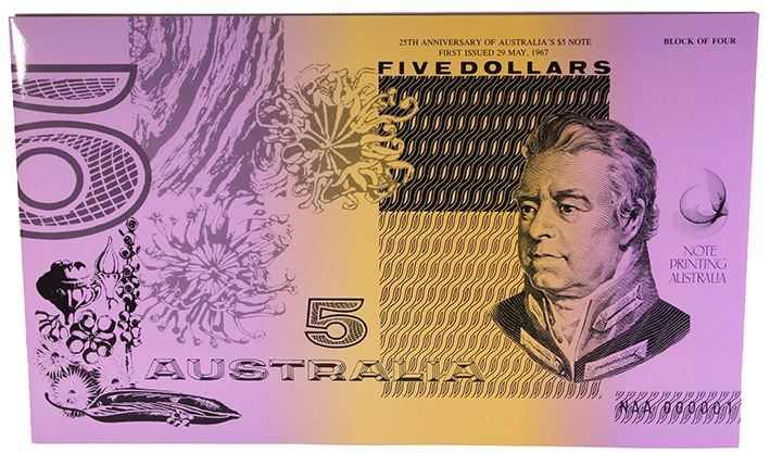 Five Dollar Uncut Banknote Folder, 25th Anniversary of Australia's $5 Note, Block of Four, 1992