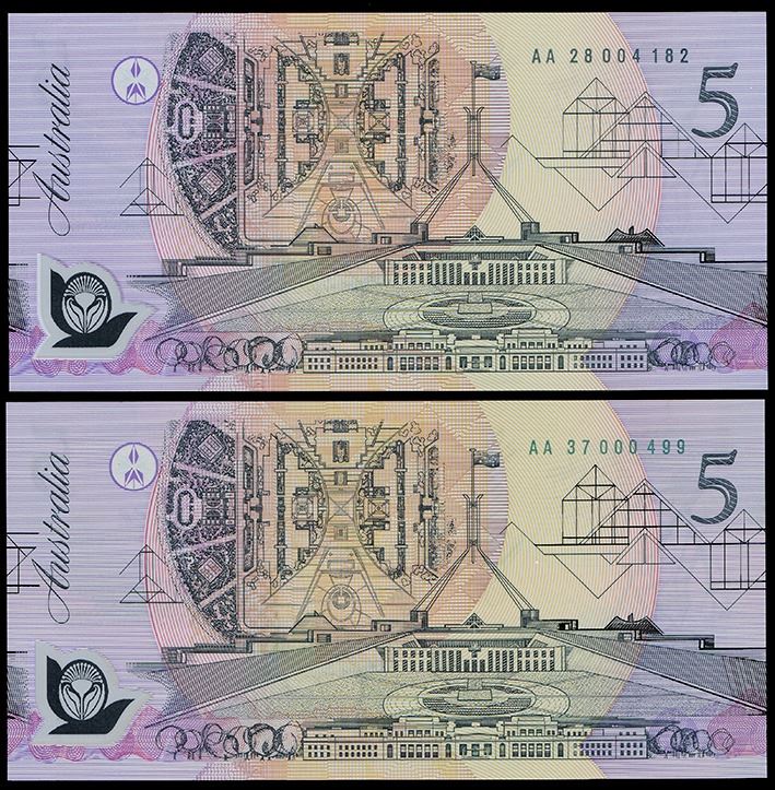 AA 37 000499, Pale Green serials with low serial numbers and "7 JULY 1992" overprint ex NPA $5 Last/First note folder. Recent discovery not yet catalogued. With normal Dark Green serial issue AA 28 004182. Uncirculated (2 notes)
