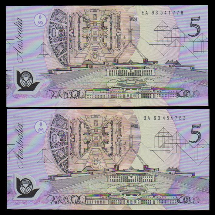 Australia, Five Dollars, Fraser/Evans, 1993, (R.216F, R216L) First Prefix, BA/93454763 & Last Prefix, BA/93541778, both Uncirculated (2 notes)