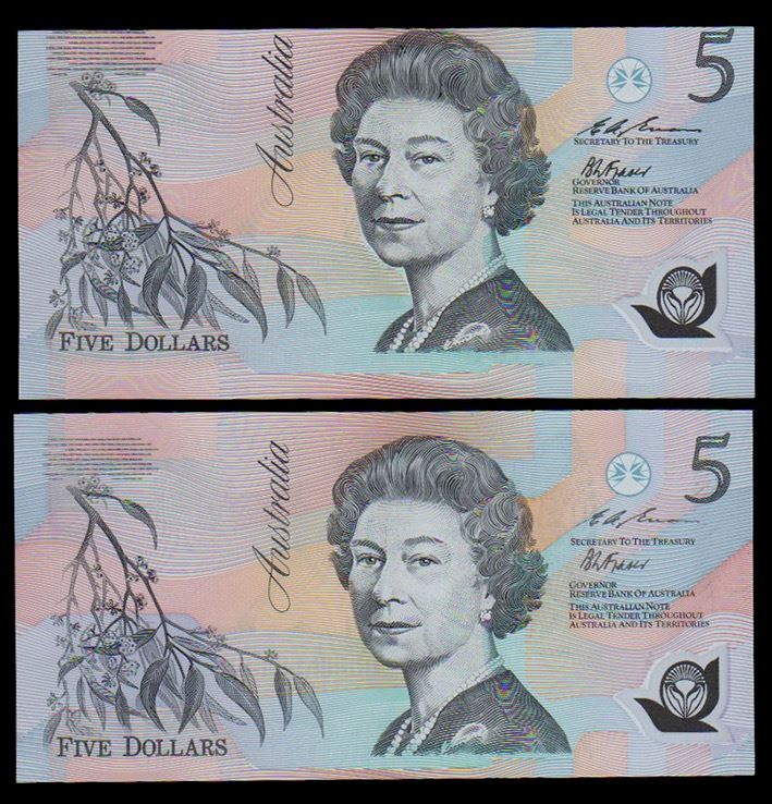 Australia, Five Dollars, Fraser/Evans, 1993, (R.216F, R216L) First & Last Prefix