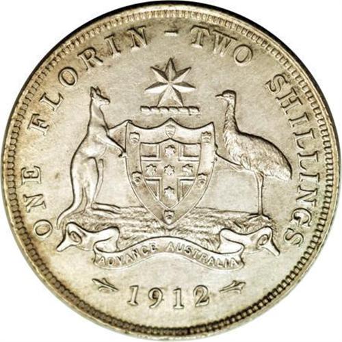 <B>George V Florin 1912,</B></I> KM27, bold XF-AU, very sharply struck with full details in the King's crown, cleaned at one time leaving noticeable hairlines on both sides. <BR><BR><b>Shipping:</b> Coins & Currency (<a target="_blank" href="http://www.heritageauctions.com/common/shipping.php">view shipping information</a>)