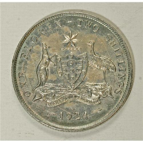 <B>George V Florin 1924, </B></I>KM27, XF, cleaned and retoned but with all diamonds and pearls on the crown band clearly visible. Scarce date, particularly in grades above VF.<BR><BR><b>Shipping:</b> Coins & Currency (<a target="_blank" href="http://www.heritageauctions.com/common/shipping.php">view shipping information</a>)