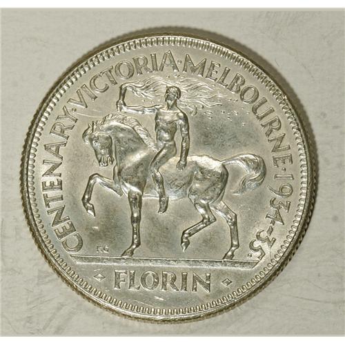 <B>George V Florin (1934), </B></I>KM33, sharp AU, lightly cleaned, marking the Centennial for Victoria and Melbourne.<BR><BR><b>Shipping:</b> Coins & Currency (<a target="_blank" href="http://www.heritageauctions.com/common/shipping.php">view shipping information</a>)